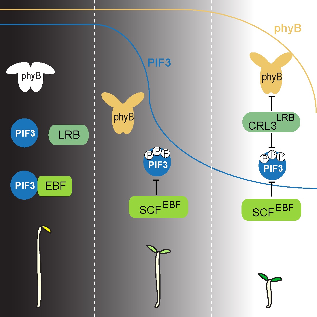 光提供了植物生长所需要的能量,同时作为核心环境信号因子调控着植物各个阶段的生长发育。此前,通过筛选与光受体相互作用的因子,人们鉴定到光信号通路的核心转录因子phytochrome Interacting Factor 3 (pIF3)。在暗中,pIF3稳定存在,利于植物在土壤等暗环境中的生长;见光后,pIF3迅速降解,伴随着启动植物的光形态建成等生命过程。pIF3在暗中的积累以及见光后的迅速降解对于植物在不同光环境中的生存具有决定意义,它的稳定性如何受调控一直是植物光信号转导领域的核心科学问题。CRL3LRBs是已报道的促进pIF3降解的E3连接酶,然而遗传学分析表明CRL3LRBs是光形态建成的负调控因子,它们可同时降解pIF3及红光受体phyB [Science 344, 1160-1164 (2014)]。因此,CRL3LRBs的主要功能可能是促进phyB的降解从而削弱光信号作用。