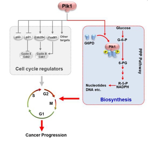 研究人员进一步的机制研究发现,plk1通过结合并磷酸化修饰G6pD,使G6pD形成二聚体增多,从而促进酶活性以及整个磷酸戊糖途径。增强的磷酸戊糖途径对于肿瘤细胞的周期进程以及肿瘤的发生发展有重要的促进作用。
