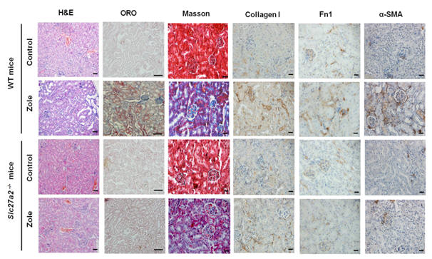 唑来膦酸处理后的Slc27a2敲除小鼠,其肾纤维化及毒性大大降低