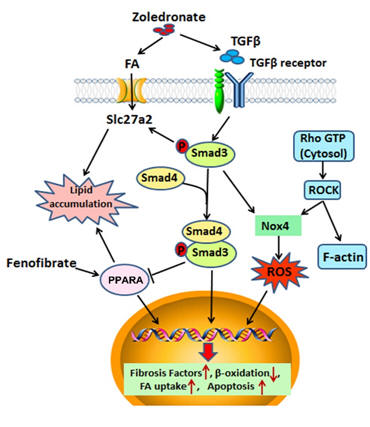 陈立功课题组通过建立唑来膦酸导致细胞、动物毒性模型,系统性利用蛋白组学、代谢组学、分子生物学等技术手段发现,唑来膦酸一方面可以通过激活TGFβ-Smad3信号通路,导致胶原蛋白表达的升高和金属蛋白酶抑制剂合成增加,胶原的肾脏沉积增多,形成肾脏组织纤维化;另一方面通过促进长链脂肪酸转运蛋白SLC27A2表达增加脂肪酸摄取、同时抑制脂肪酸β氧化导致脂质积累,从而对肾组织产生脂毒性,促使肾小管或肾间质细胞去分化,进而促使肾脏纤维化。