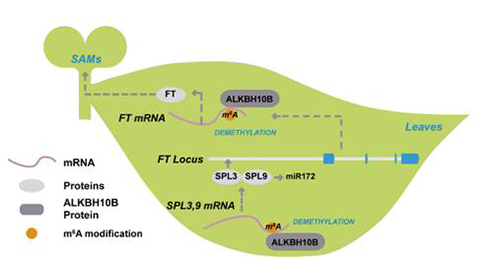 研究人员通过序列比对,找到拟南芥中N6-甲基腺嘌呤修饰潜在的去甲基酶ALKBH10B,着重研究它的去甲基功能及其在拟南芥生命活动中的调控作用。