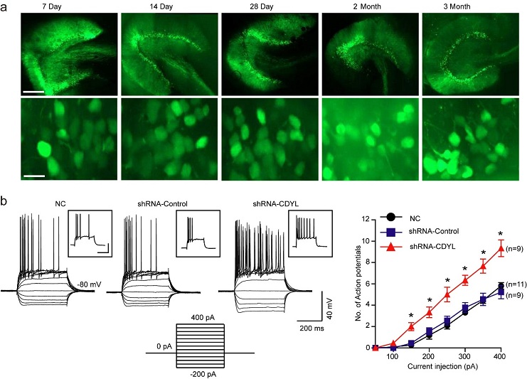 图注:a.大鼠背侧海马齿状回颗粒细胞病毒表达荧光示意图。感染病毒后7天,14天,28天,60天,90天表达情况。比例尺,500微米(上),15微米(下)。b. 电流钳记录颗粒细胞电压电流示意图。颗粒细胞分别感染CDYL-shRNA慢病毒,CDYL-shRNA对照慢病毒,和正常对照组。给细胞注入一系列以50皮安为梯度的电流,持续400毫秒,将细胞维持在-80毫伏,记录细胞动作电位。统计细胞动作电位个数。*p<0.05, 单因素方差分析。