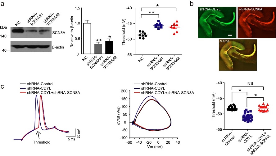 图注:a. 蛋白免疫印迹显示海马齿状回颗粒细胞感染SCN8A-shRNA后,SCN8A表达量显著降低,两种病毒基本无差异,并且电流钳记录显示两种病毒感染后动作电位阈值相对对照组都显著增加。*p<0.05, **p<0.01,非配对双尾T检验。b. 两种慢病毒感染海马齿状回14天后的免疫荧光示意图。比例尺,200微米。c. 单个动作电位的示意图,以及动作电位统计图。三组海马齿状回颗粒细胞分别是感染慢病毒shRNA-Control,shRNA-CDYL以及同时感染shRNA-CDYL 和 shRNA-SCN8A两种慢病毒。*p<0.05,单因素方差分析。