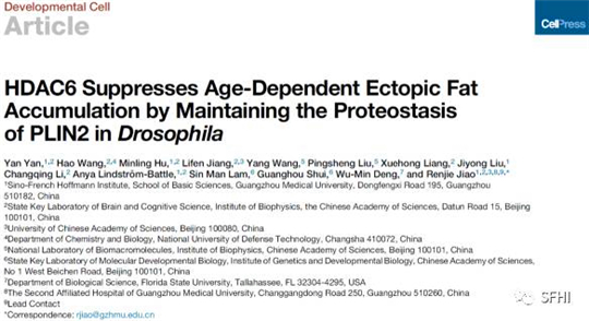近日,广州霍夫曼免疫研究所焦仁杰实验室关于脂肪过度积累引起早衰的最新研究成果“HDAC6 SuppressesAge-Dependent Ectopic Fat Accumulation by Maintaining the proteostasis of pLIN2in Drosophila”发表在国际知名期刊Developmental Cell上。