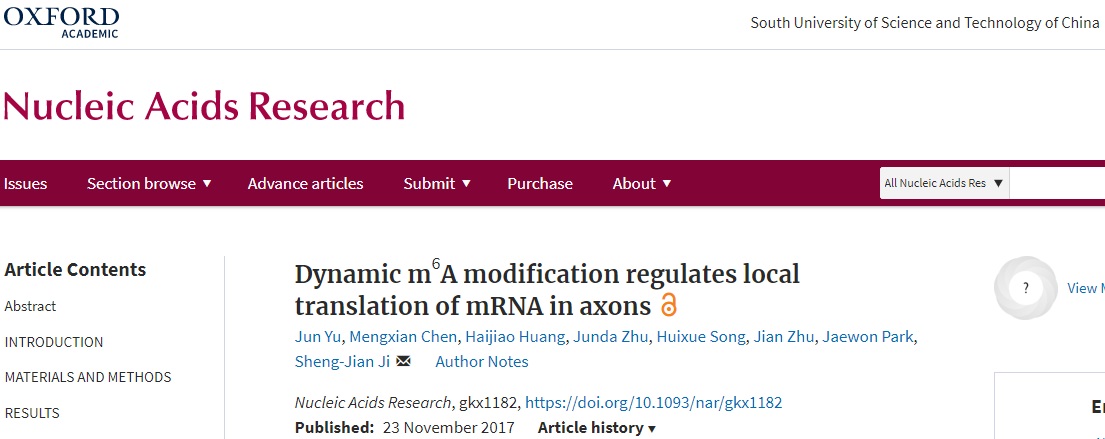 南方科技大学生物系姬生健课题组在著名国际期刊《Nucleic Acids Research》(《核酸研究》)在线发表了题为“Dynamic m6A modification regulates local translation of mRNA in axons”的研究论文。这一研究揭示了m6A修饰通过调控信使核糖核酸(mRNA)在神经元轴突中的局部翻译进而影响轴突生长的新机制。
