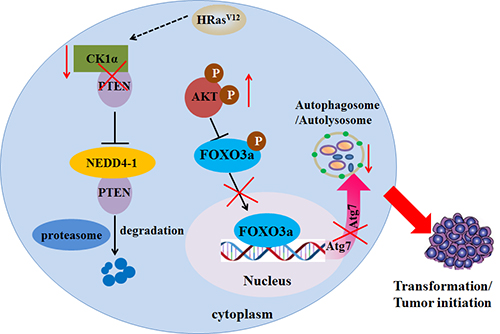 同期还刊登了西班牙CIC bioGUNE生物科学协作研究中心Ivana Hermanova 和 Arkaitz Carracedo教授的述评文章 “CK1α promotes tumour suppressive autophagy”,指出“该研究解析了CK1α的抑癌作用,首次揭示了CK1α通过之前未知的AKT/FOXO3a/Atg7信号轴介导pTEN依赖性的细胞自噬,提示上述信号分子调节细胞的适应性、程序性衰老以及生命周期将是重要的研究方向”。