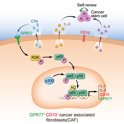 这项研究通过临床标本高通量筛选发现的膜蛋白,首次鉴定了肿瘤微环境中的CD10+GpR77+成纤维细胞亚群;阐述了该类型成纤维细胞亚群通过分泌IL-6、IL-8维持肿瘤干细胞的干性,促进肿瘤形成并导致化疗耐药;其机制是通过补体分子对炎症转录因子翻译后修饰的调控作用实现的。揭示了特殊成纤维细胞亚群调控肿瘤干细胞干性,进而导致化疗耐药的新机制,为靶向肿瘤干细胞微环境的治疗提供了新思路。