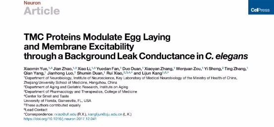 浙江大学康利军研究组在Neuron杂志上发表了题为“TMC proteins modulate egg-laying and membrane excitability through a background leak conductance in C. elegans”的研究论文,揭示TMC-1和TMC-2可通过恒定的背景Na+电流,维持神经和肌肉细胞的静息膜电位和兴奋性,并调控相应的行为范式。这一发现不仅为阐明先天性耳聋的机制提供了新的线索,而且首次揭示了肌肉细胞中的兴奋性背景钠通道,为相关神经、肌肉系统疾病的诊断、治疗和药物开发奠定了科学基础。