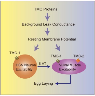 康利军研究组发现,TMC-1在秀丽线虫神经、肌肉系统中广泛表达,而TMC-2特异性表达于肌肉细胞中。 TMC-1和TMC-2的缺失,均会导致秀丽线虫产卵行为缺陷。康利军课题组的研究人员首先想到产卵行为跟机械感受之间可能存在密切的联系,也就是卵到达排卵部位后,可能对相关的神经元和肌肉组织产生挤压作用,而这种挤压力由什么蛋白感受,先前未见报道。