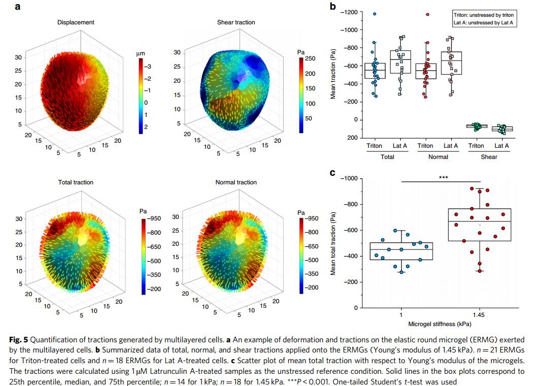 实验表明这些与生物体相容并无任何毒副作用的弹性微球和活细胞粘附后,细胞对其产生了三维正应力和剪切力。经过理论计算、模拟实验和细胞实验,研究人员发现通过定量测量弹性微球的三维形变和已知弹性球的弹性模量,就可定量测量三维生物力。