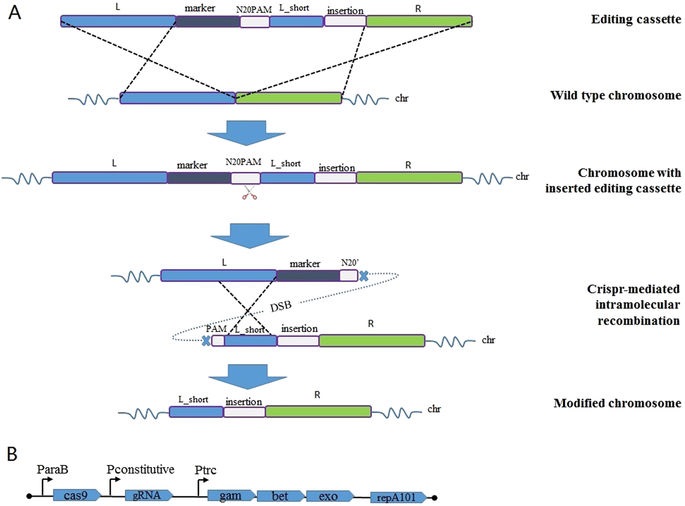 首先,将一个含有特殊“N20pAM”序列的编辑片段通过同源重组的方式整合到基因组上,再利用CRISpR/Cas9与red同源重组技术,在插入位点实现基因组内部同源重组,从而实现基因组无痕编辑。该方法可以在基因组任意位点实现非脱靶编辑,编辑过程仅需要合成一个编辑片段,在通用的pCAGO质粒的帮助下便可完成编辑,无需构建gRNA质粒。该方法的构建为合成生物学研究提供了简单易行的新技术手段,降低了CRISpR/Cas9技术的使用门槛。