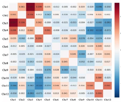 图3 水稻染色体间交互的 contacts 观测值与理论值比较热图